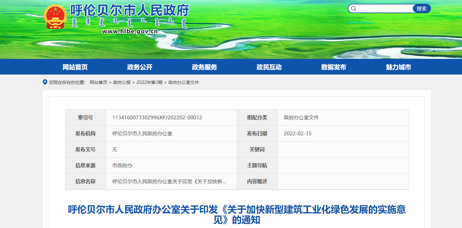 2022年裝配式建筑占比力爭達到15%,以后逐年提高,到2025年,裝配式建筑面積占比力爭達到30%。2023年起,新建裝配式建筑要全面實行裝配式全裝修,到2025年,呼倫貝爾市中心城區商品房裝配式裝修率力爭達到30%以上,旗市商品房裝配式裝修率力爭達到15%以上。